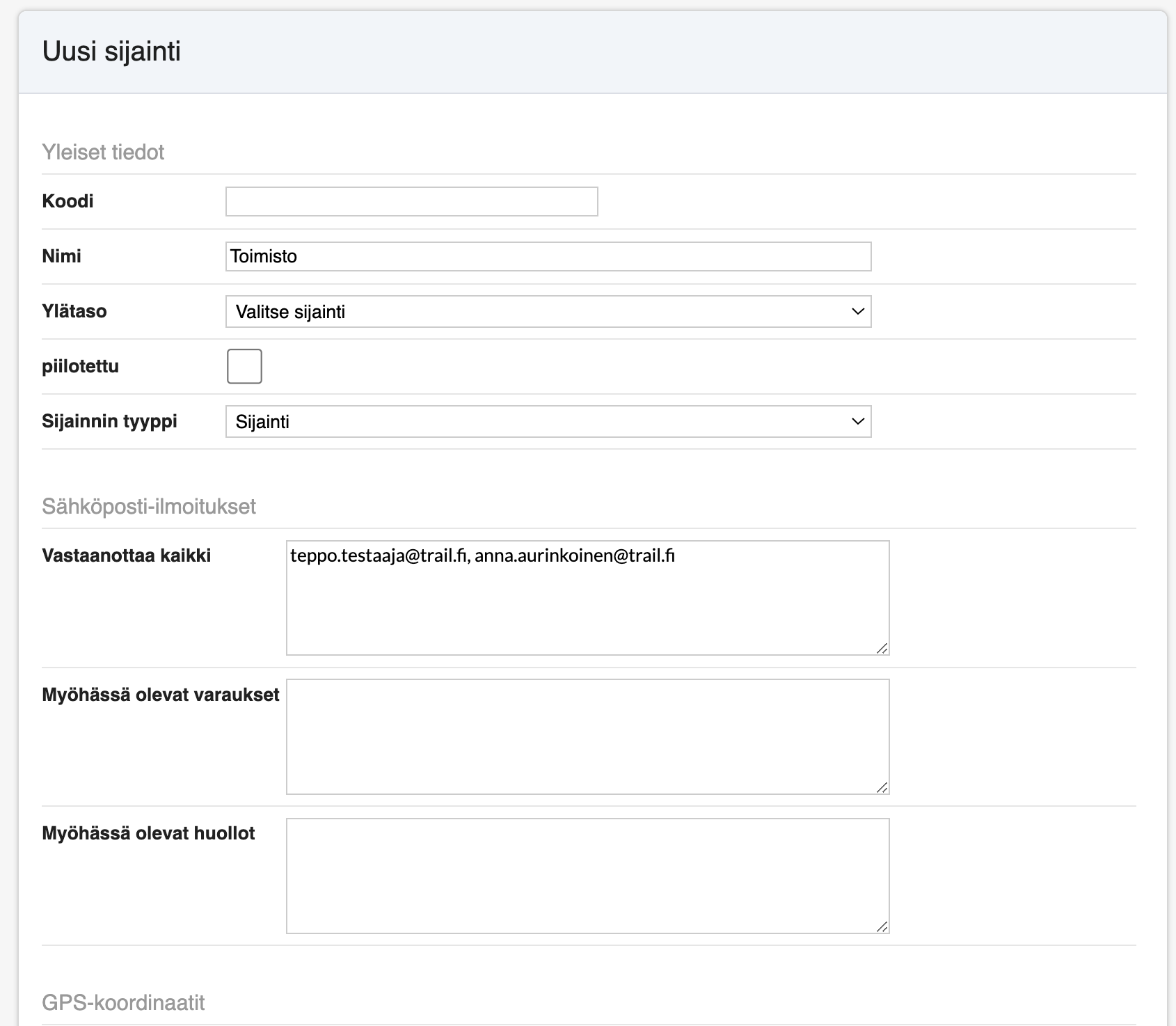 Muokattavia tietoja ovat samat kuin uuden sijainnin luonnissa (nimi, koodi, osoitteet, sähköposti-ilmoitukset jne.).