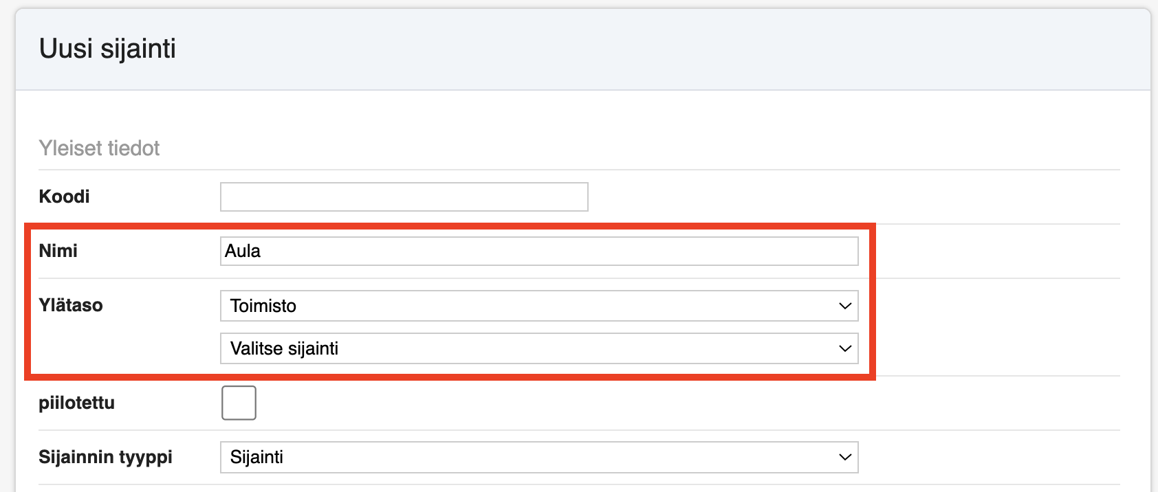 - Ylätaso: Valitse mihin sijaintiin tila kuuluu. Jos kyseessä on pääsijainti, kuten uusi rakennus, voi kohdan jättää tyhjäksi.