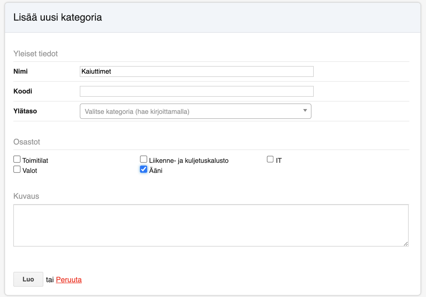 - Osastot: Valitse, mihin osastoon tai osastoihin kategoria yhdistetään. Tämä rajaa käyttäjille näkyvät kategoriat vain heidän osastoihinsa, mikä helpottaa käyttöä.