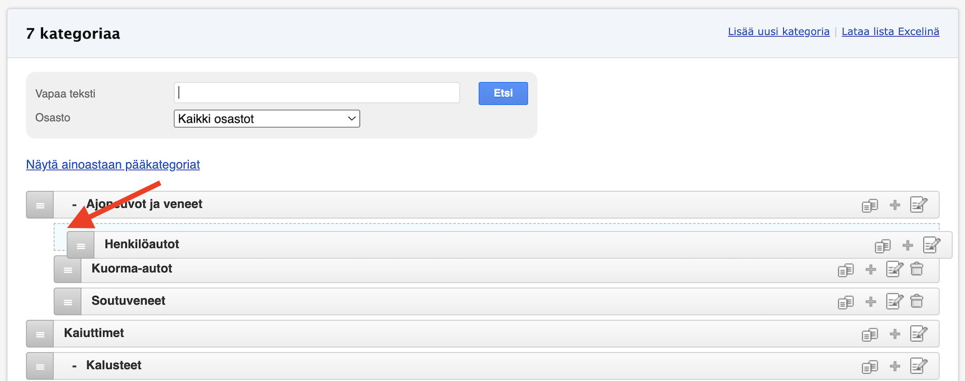 Lisäsitkö vahingossa alakategorian pääkategoriatasolle? Voit vaihtaa kategorian paikkaa hierarkiassa: