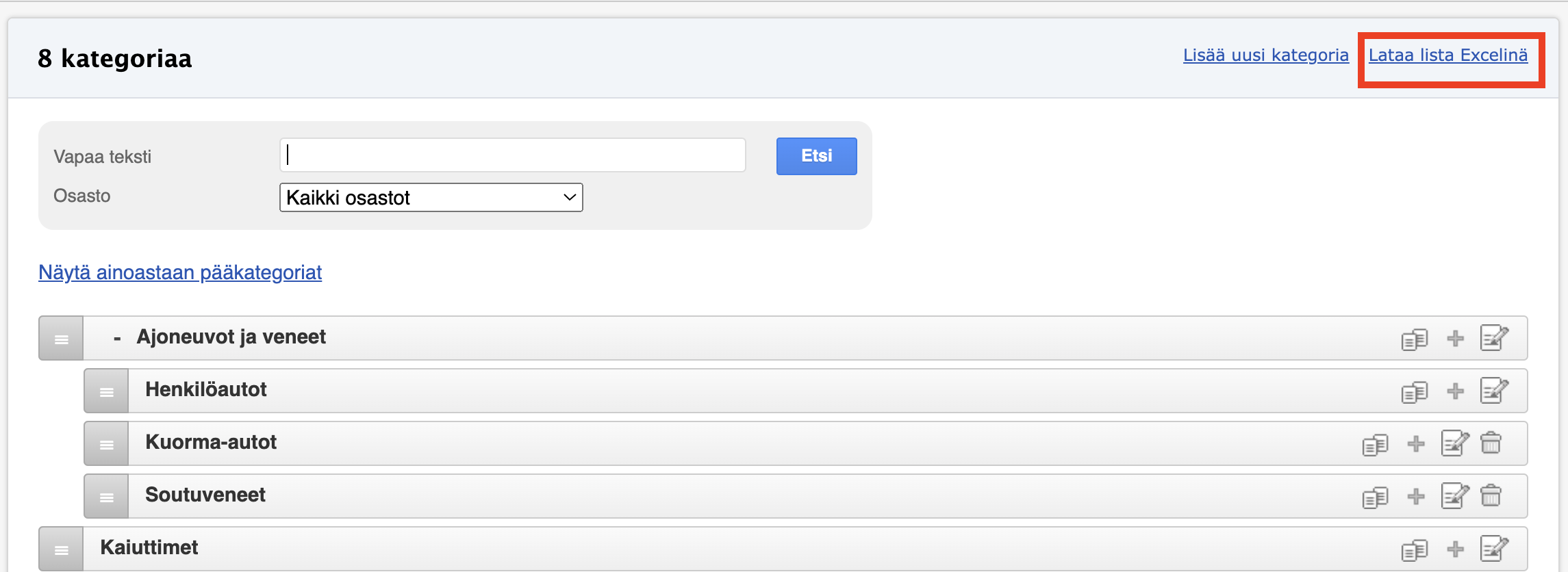 - Klikkaa kategorian nimeä tai sen vieressä näkyvää muokkaa-kuvaketta.