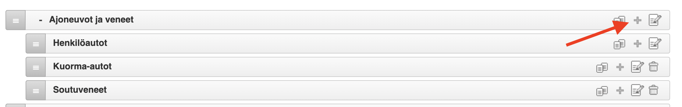 - Voit vaihtoehtoisesti etsiä listalta pääkategorian, ja klikata sen + -symbolia. Tällöin pääkategoria on jo valmiiksi täytetty lomakkeelle.